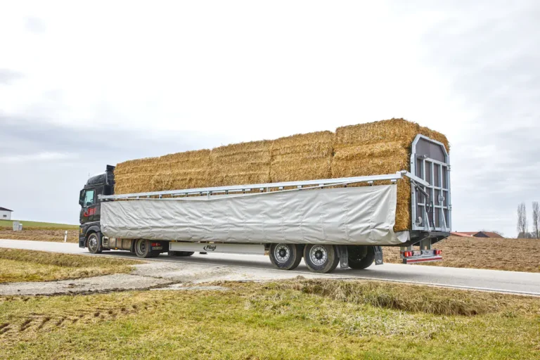 • Ladungssicherung links, hydraulisch nach unten klappbar, für Rund- und
